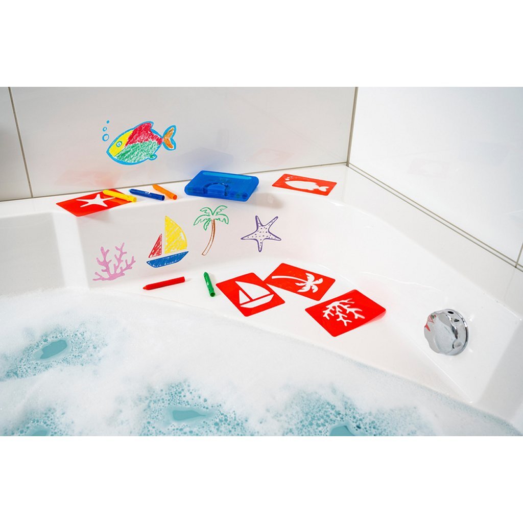Deze krijtjes zijn onmisbaar voor kleine kunstenaars. Ze gaan mee in bad en vormen de saaie witte badwand om tot een prachtig kunstwerk? is het nou niet zo mooi als verwacht, superhandig de tekening is heel makkelijk af te wassen! Deze set bevat 10 krijtjes in allemaal verschillende kleuren en 5 patronen. De patronen plakken gemakkelijk met water op de bad / douche wand en zijn ook weer gemakkelijk te verwijderen. Ze kunnen worden hergebruikt. De set wordt geleverd in een handige kunststof opbergbox.
