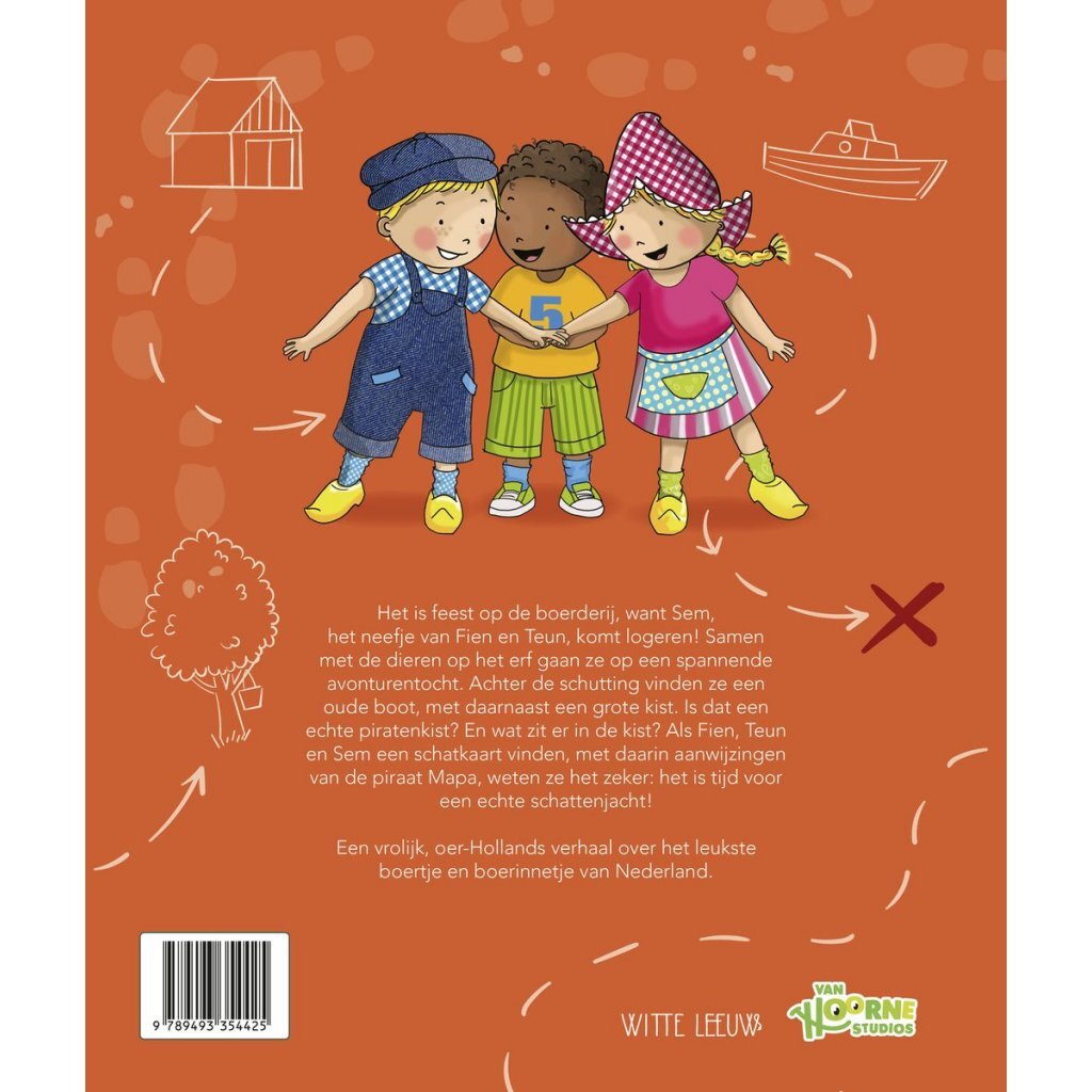 Sem, het neefje van Fien en Teun, komt logeren op de boerderij! Samen gaan ze op avontuur. In de schuur vinden ze een oude boot met een echte schatkist vol piratenkleding en… een schatkaart. Tijd voor een schattenjacht! Een avontuurlijk verhaal boordevol humor en fantasie.