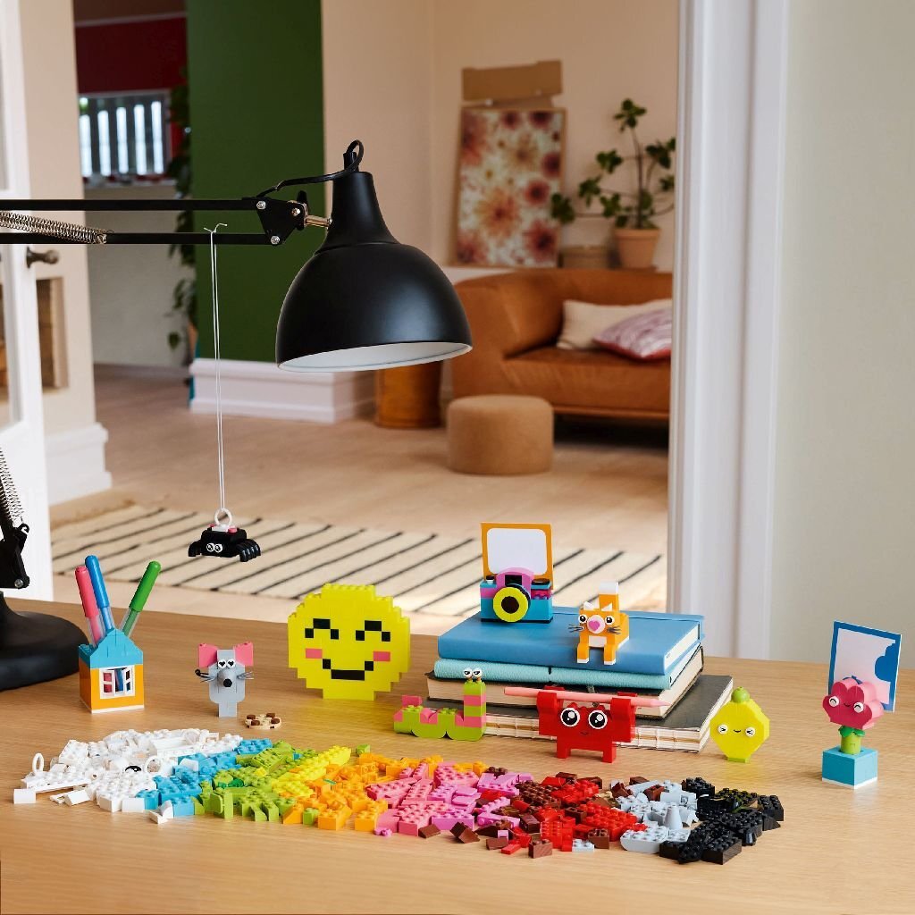 Lego 11042 Classic Creatieve Knutseldoos De Creatieve knutseldoos bevat suggesties voor 10 snel te bouwen modellen waar iedereen vrolijk van wordt. Kinderen kunnen deze modellen ombouwen tot 12 nieuwe speeltjes en ze vervolgens verder aanpassen, zodat ze hun kamer kunnen inrichten met leuke en handige voorwerpen die ze zelf hebben gebouwd. De spin, bij en vogel hebben ophangelementen. De krab, de aap en het huis kunnen kleine voorwerpen vasthouden, zoals een potlood of tandenborstel. De bloem, de camera, de markeerstift, het hart en de cactus bevatten een klemmetje waaraan kinderen een briefje, kaart of foto kunnen bevestigen (gekleurd papier is inbegrepen in de set). Andere modellen zijn een kat, muis, citroen, worm en smiley. Een leuke en praktische set die de creativiteit van kinderen zal inspireren! Geschikt voor kinderen vanaf 5 jaar.