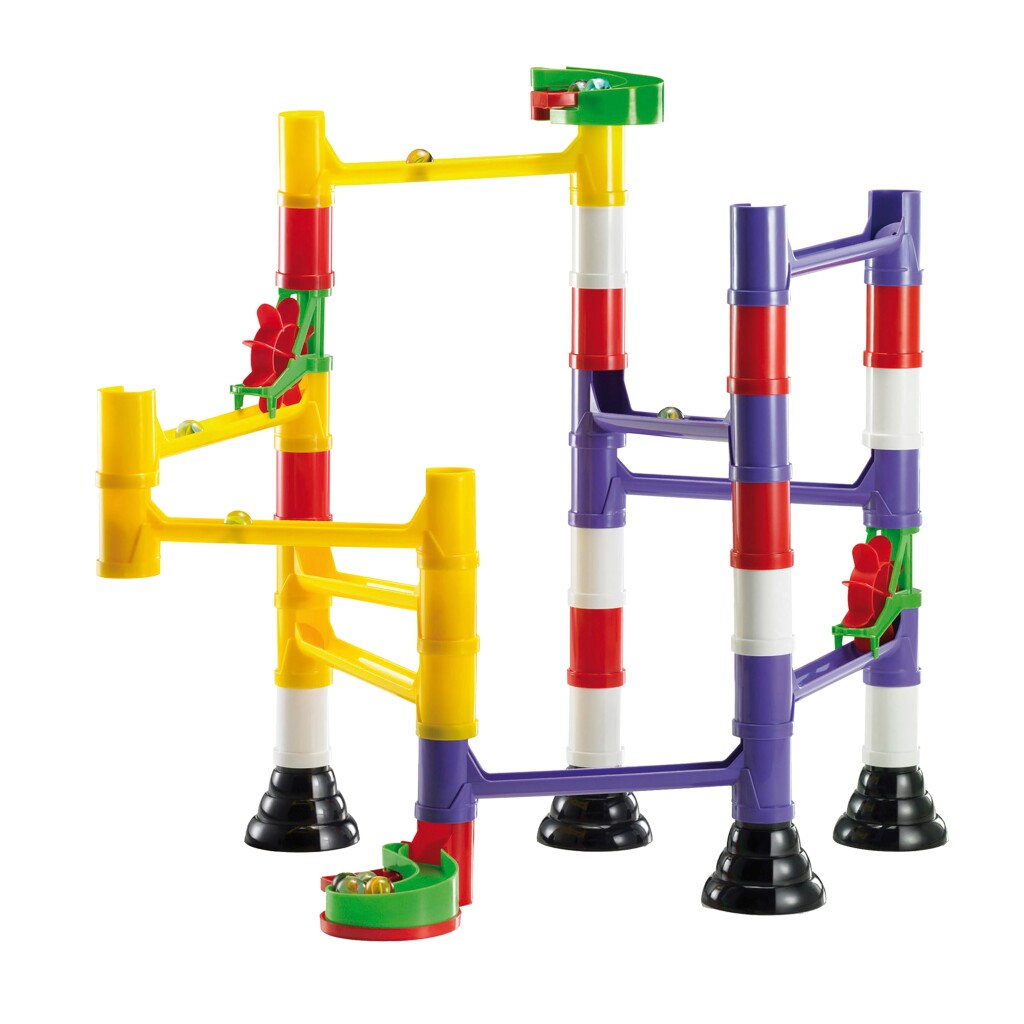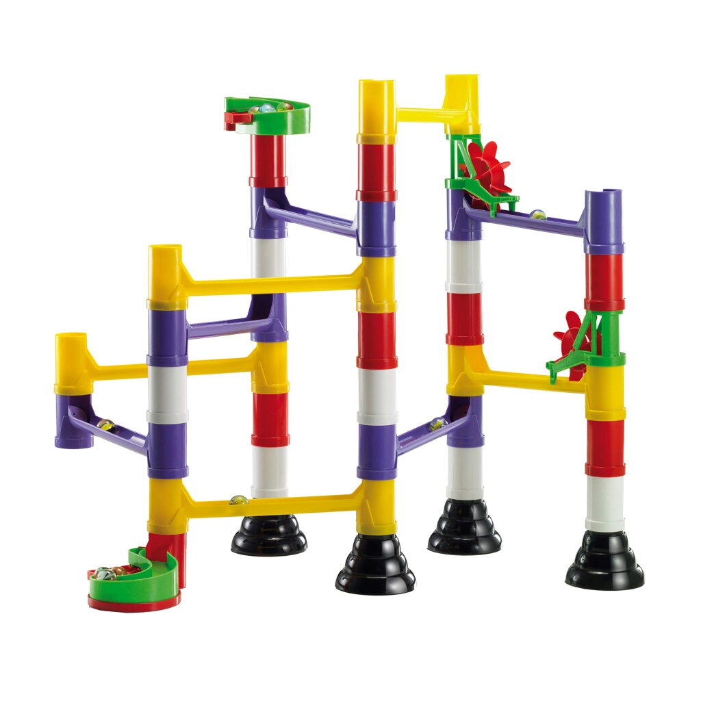 Stel je eigen knikkerbaan samen met deze uitdagende Quercetti Migoga set. Volg de voorbeelden die op de doos staan afgebeeld of maak je eigen combinaties met behulp van onder andere bruggen, pilaren, en draaiende wielen. Alle onderdelen passen gemakkelijk in eindeloze combinaties en alle Migoga knikkerbanen van Quercetti kunnen op elkaar aangesloten worden.