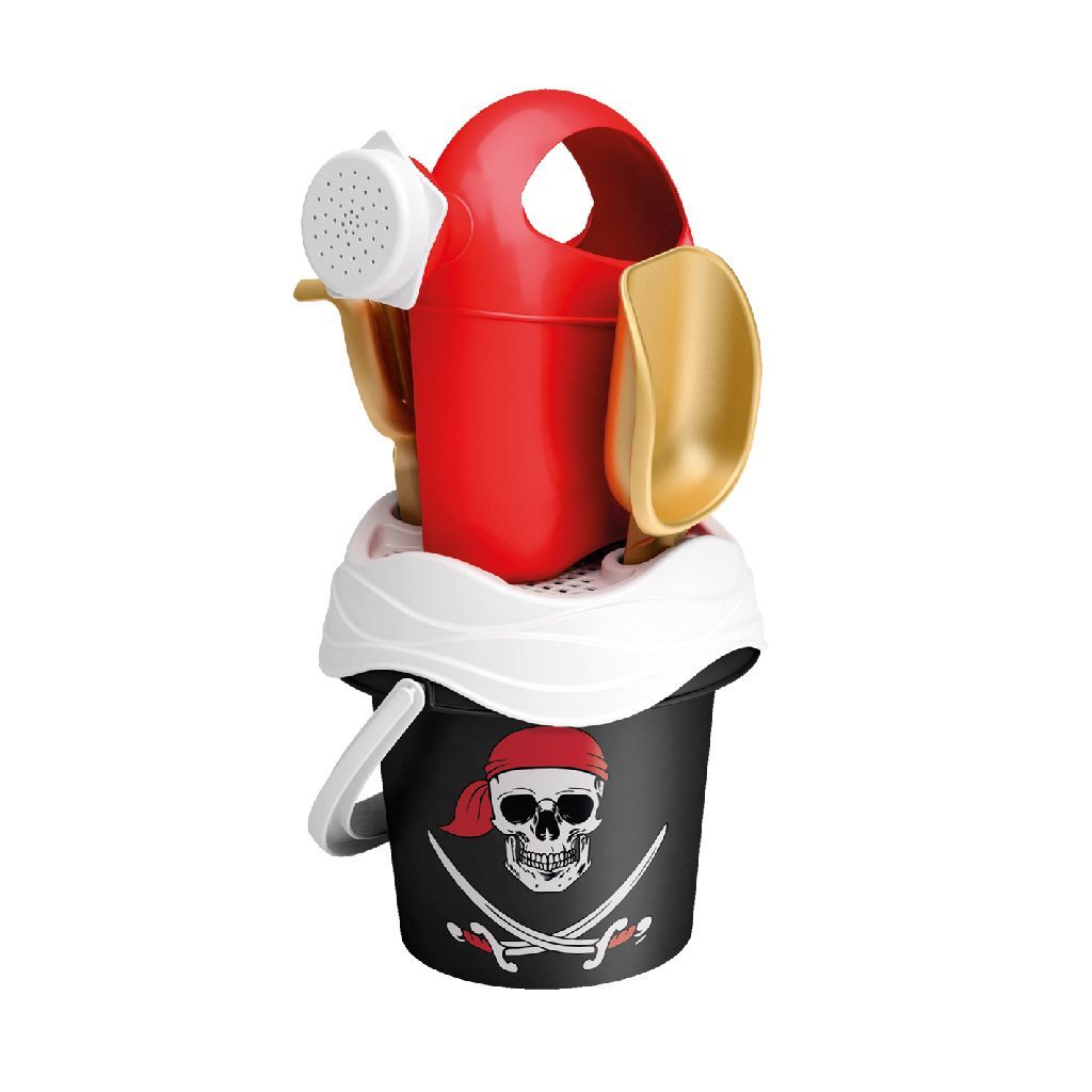Vijf-delige emmerset in piratenthema, bestaande uit een emmer met hengsel, zeef, een gieter en een harkje en schepje. De set is uitgevoerd in de kleuren zwart, wit, rood en goud en de emmer is voorzien van een stoere print met piraat. De emmer heeft een hoogte van 11 cm. Geschikt voor kinderen vanaf 1,5 jaar.