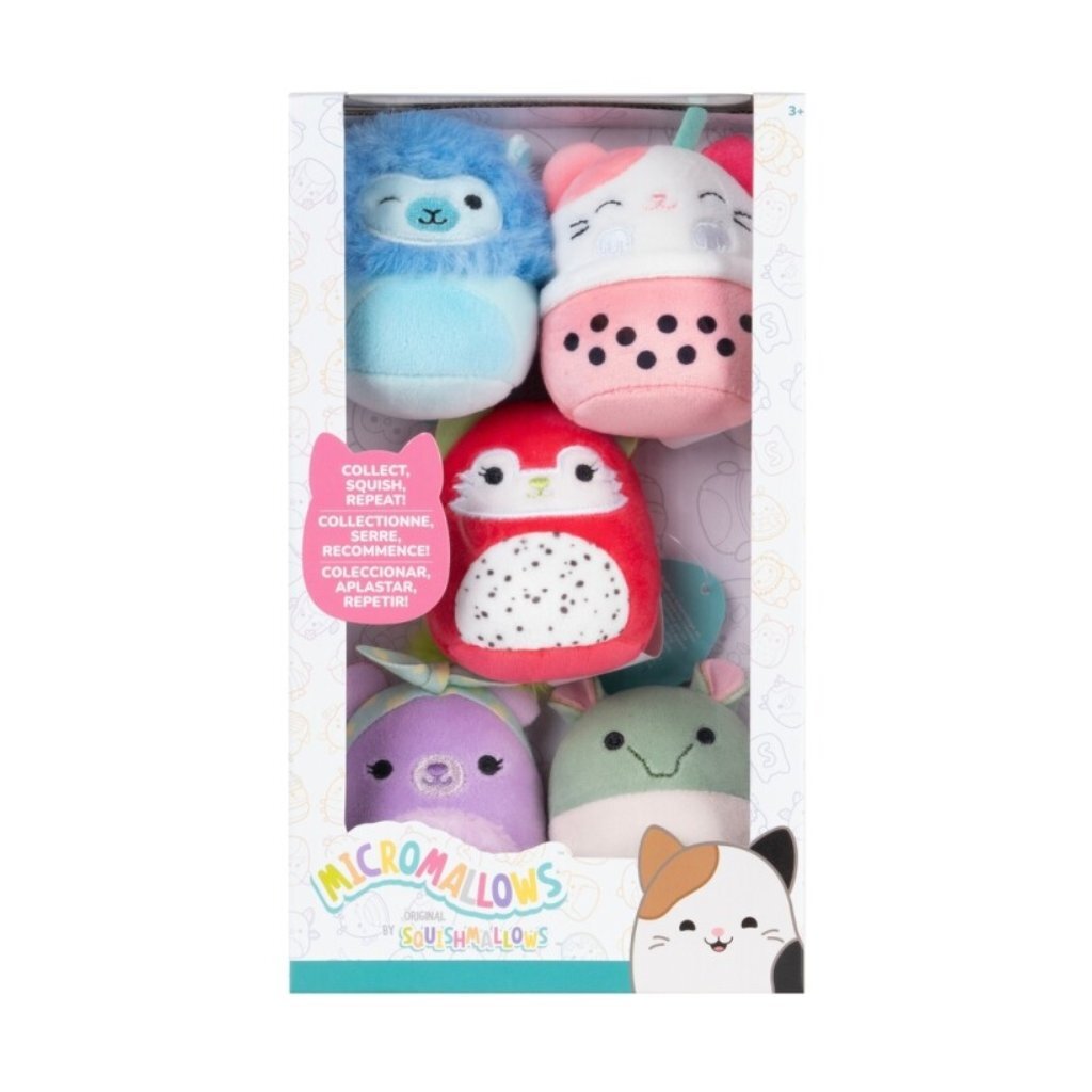 Squishmallows Micromallows knuffels Silvy, Rozen, Aarin, Roxy en Gerald. Alle vijf 6,5 cm groot.