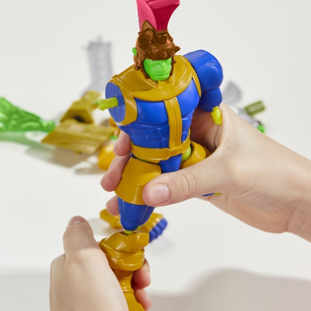 MixMashers Marvel Avengers Thanos MixMashers luxe Marvel-actiefiguren zijn verzamelobjecten met onderdelen en stukken die uit elkaar kunnen om te combineren, om zo unieke aangepaste actiefiguren te maken. MixMashers-speelfiguren hebben 16 verbindingspunten en zijn gemaakt op een schaal van 12 cm. De verbindingen zijn universeel, zodat ze compatibel zijn binnen de hele lijn en een lange levensduur hebben.Bij de luxe Marvel Thanos-actiefiguur horen een draaiende Hulk-hand met wapenstok en Hulk-hoofd met helm, 5 accessoires, inclusief Infinity Gauntlet, 2 zwaarden en groen klauwprojectiel. Geschikt voor kinderen vanaf 4 jaar.