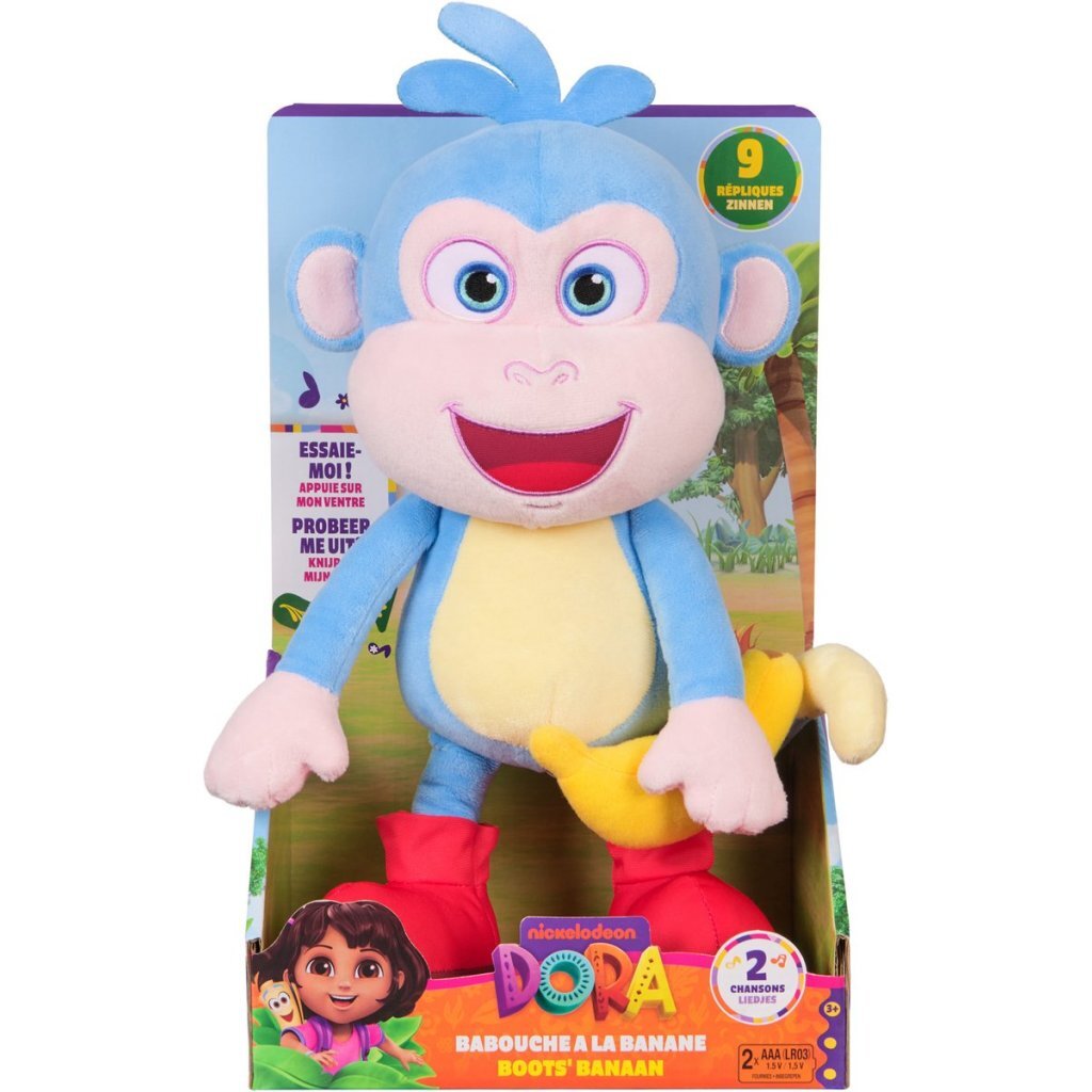 Dora interactieve knuffel Boots Deze schattige pluche knuffel van 33 cm brengt Doras beste vriend tot leven, met banaan-tastische details die fans geweldig zullen vinden. Hij praat Nederlands en heeft zachte blauwe vacht met crèmekleurige accenten. Hij heeft ook een gele banaan die hij met zijn met klittenband gevoerde handjes kan vasthouden voor extra sensorisch speelplezier. Zijn zachte, knuffelige lichaam en uitnodigende, heldere glimlach stimuleren tactiel spel en dat alles veilig voor peuters vanaf 3 jaar.Deze innovatieve en interactieve knuffel komt tot leven met een zachte druk op zijn buik en zingt en praat dan! Boots zingt 2 liedjes, waaronder het themalied van hem en Dora, en zegt 9 bekende, grappige zinnetjes uit de show!