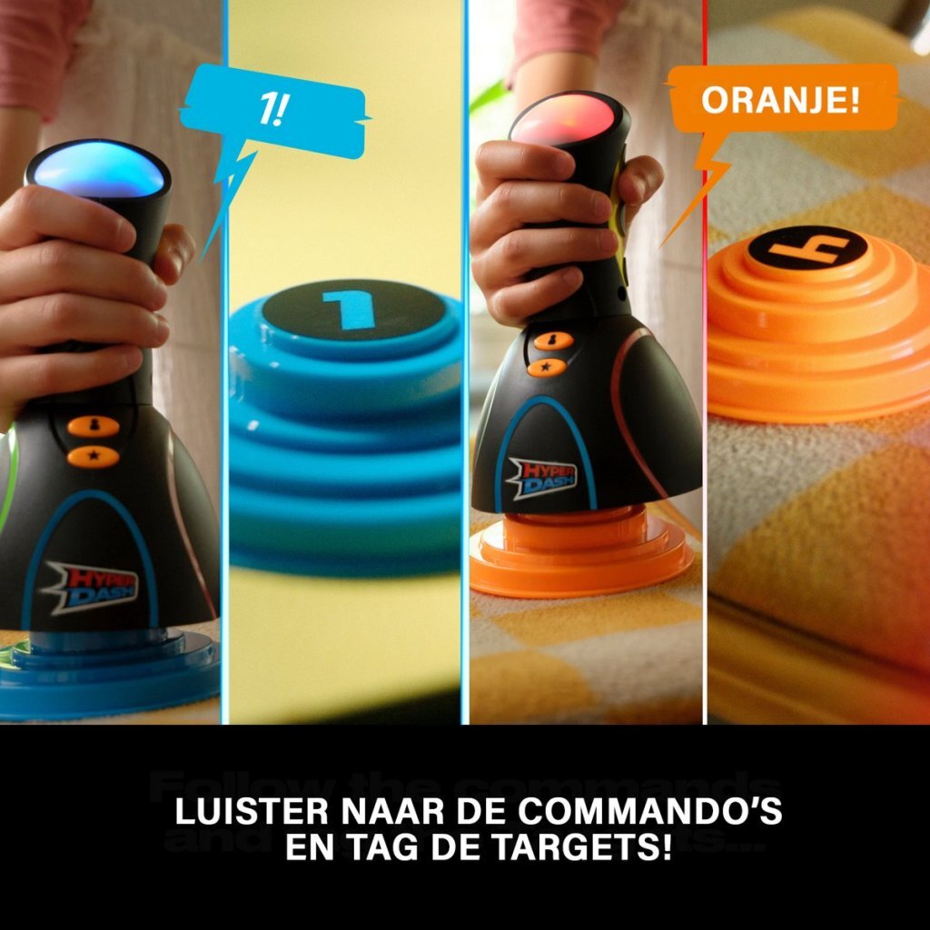 Hyper Dash is een elektronisch racespel, waar je reactievermogen optimaal wordt getest! Het spel bestaat uit de elektronische Hyper Dash Tagger en 5 gekleurde Targets met nummers erop. Maak een speelveld met de 5 Targets. Er zijn spelniveaus, van makkelijk tot uitdagend. Op niveau 1 tag je alleen gekleurde targets. In niveau 2 worden kleuren én cijfers gecombineerd. Op niveau 3 volgen razendsnelle opdrachten met meerdere doelen tegelijk! De levels worden steeds moeilijker. Speel solo of in teamverband en race tegen de klok kies 30, 60 of 90 seconden. Luister goed naar je Tagger en houd je ogen op het licht: Groen! 5! Rood! 2! en tag zo snel mogelijk de juiste targets. Wie reageert het snelst? Wie scoort het hoogst? Hyper Dash is actie, fun én competitie voor jong en oud! Ben jij klaar om te racen? Let's Hyper Dash!