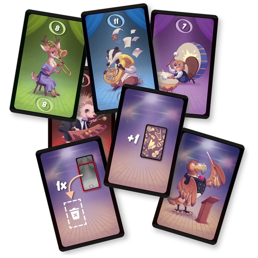 999 Games Audition Als beroemdedirigentben je voortdurend op zoek naar talent. Je hebt echter sterkevoorkeurenwat betreft de omvang van jouw orkest. Je wilt uitsluitendsolistenofkwartettendirigeren. In dit spel probeer je daarom dejuistemuzikanten bij elkaar te zoeken.Kun jij het meest uitgebreide concert organiseren? Elke beurt neem je een muzikantenkaart van de gedekte stapel, die je naast één van de dirigentkaarten legt, of je neemt een dirigentkaart inclusief de daarbij gelegde muzikantenkaarten en legt deze voor je neer. In het laatste geval is de ronde voor jou voorbij. Je probeert zo bepaalde muzikanten te verzamelen. Uitsluitend solisten en setjes van 4 muzikanten met hetzelfde nummer leveren punten op. Wie aan het einde van het spel de meeste punten heeft, wint het spel. Audition is een tactisch kaartspelvan eigen makelij. De spelregels zijnzeer eenvoudig,maar detactische mogelijkhedenzijn enorm. Verder bevat het spelvariantenmet onder andereactiekaarten om het nog uitdagender te maken.