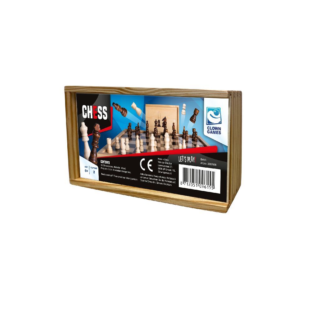 Inhoud: 32 schaakstukken. Formaat van de koning: 6 cm. Je kunt de stukken opbergen in het houten opbergkistje. Op clowngames.nl is een uitgebreide handleiding in 6 talen te vinden. Geschikt voor zowel kinderen als volwassenen: 2 spelers vanaf 6 jaar.